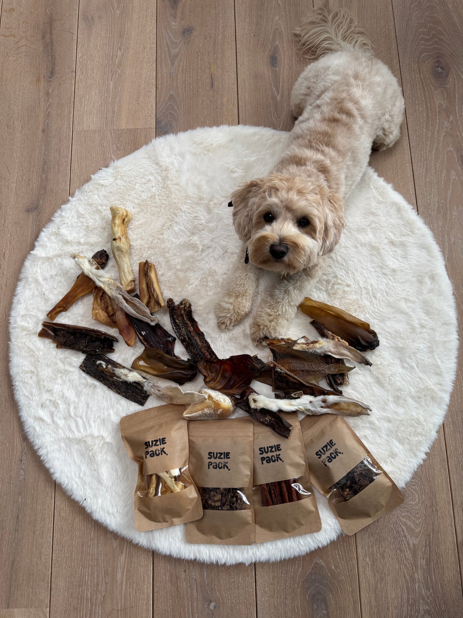 Veel snacks die je in de winkels kan kopen bespoten zijn met chemicaliën om ongedierte te voorkomen? Deze chemicaliën komen dus ook in het lijf en organen van jouw hond. Wij vonden dat zo schokkend om achter te komen dat we zelf op zoek zijn gegaan naar gezonde snacks voor onze eigen hond Suus. Deze producten zijn we ook gaan verkopen in onze trimsalon en doggy daycare. En zo is Suziepack ontstaan.